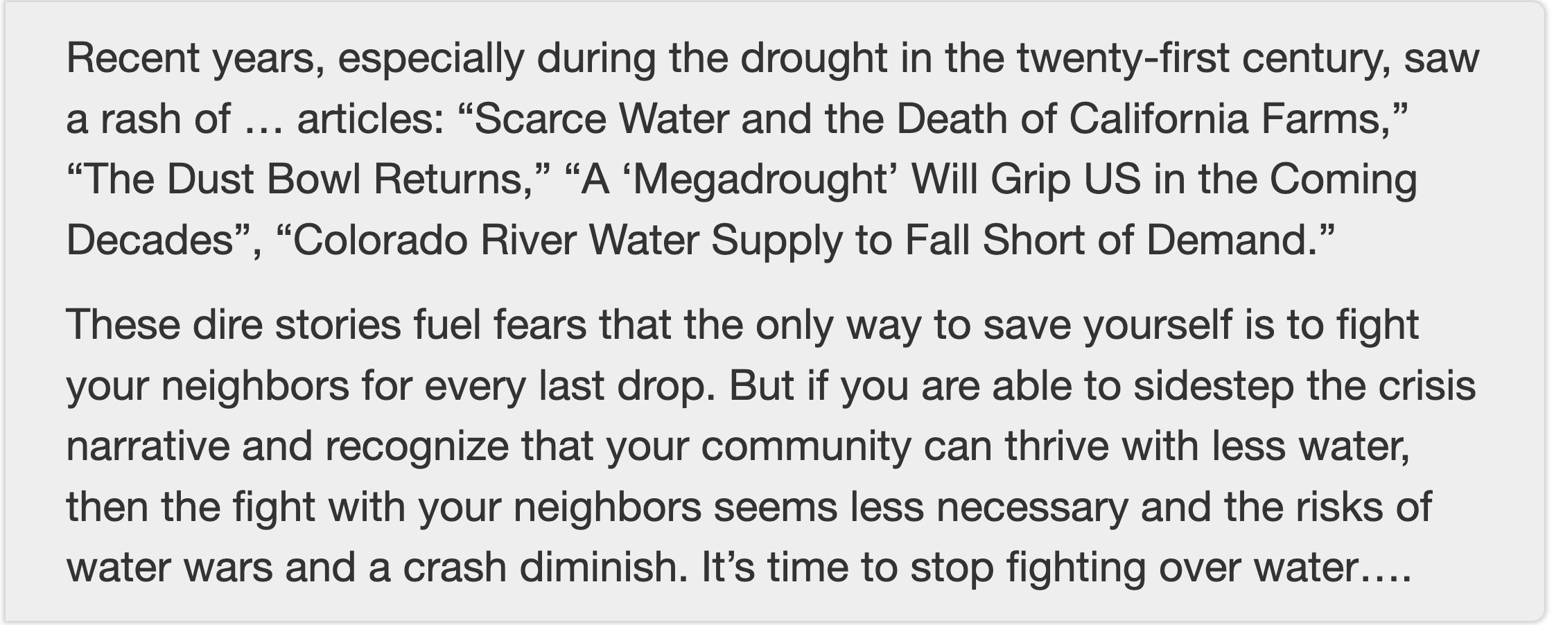 John Berggren, from Western Resource Advocates, made this point in a talk about Colorado River process, quoting here from a chapter he and I and some other folks wrote for the book Cornerstone: