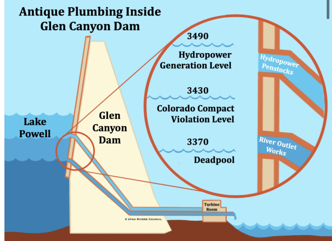 โThe Interim Guidelines rely on a โbalancingโ of the water in the two reservoirs, to keep both reservoir levels high enough so the generation of electric power can continue โ an elevation of 3,490 feet (above sea level) for Powell Reservoir and 1,000 feet for Mead Reservoir. And if that proved to be impossible in an extended period of aridification, then the last-ditch effort would be to keep levels above each reservoirโs outlet works โ an elevation of 3,370 feet in Powell and 895 feet in Mead. If the reservoirs fell below those outlet levels for either dam, then it would be impossible to convey any water at all beyond the dam. Dead pool.