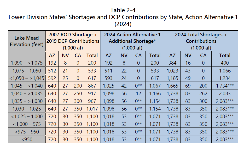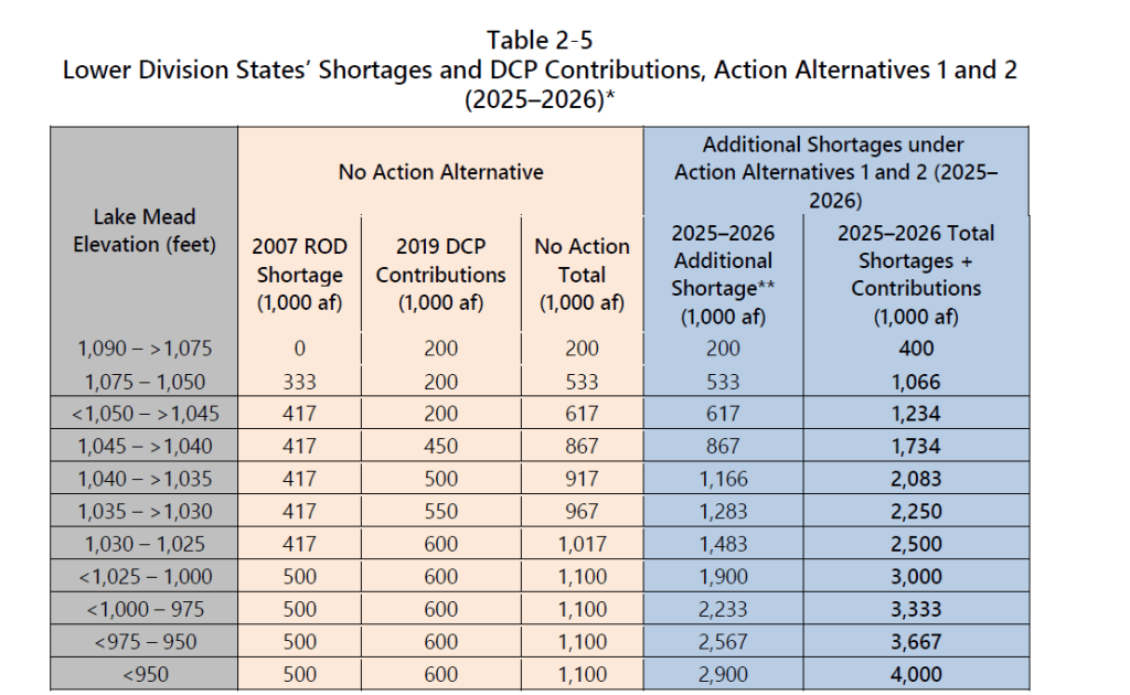 A complex table of โLake Powell Operational Tiersโ is the heart of the Interim Guidelines, definingย the various levels at which releases from Powell should increase or decrease depending on both the level in Powell and how the level in Mead was increasing or (generally) decreasing. And if levels continued to decline (which they have), the grinding gut of the Interim Guidelines is a set of โshortage conditionsโ โ levels at which delivery cuts will be imposed on the Lower Basin states. In 2022, the Bureau finally acknowledged the reality of the situation and declared the first level of cuts, on Arizona and Nevada.