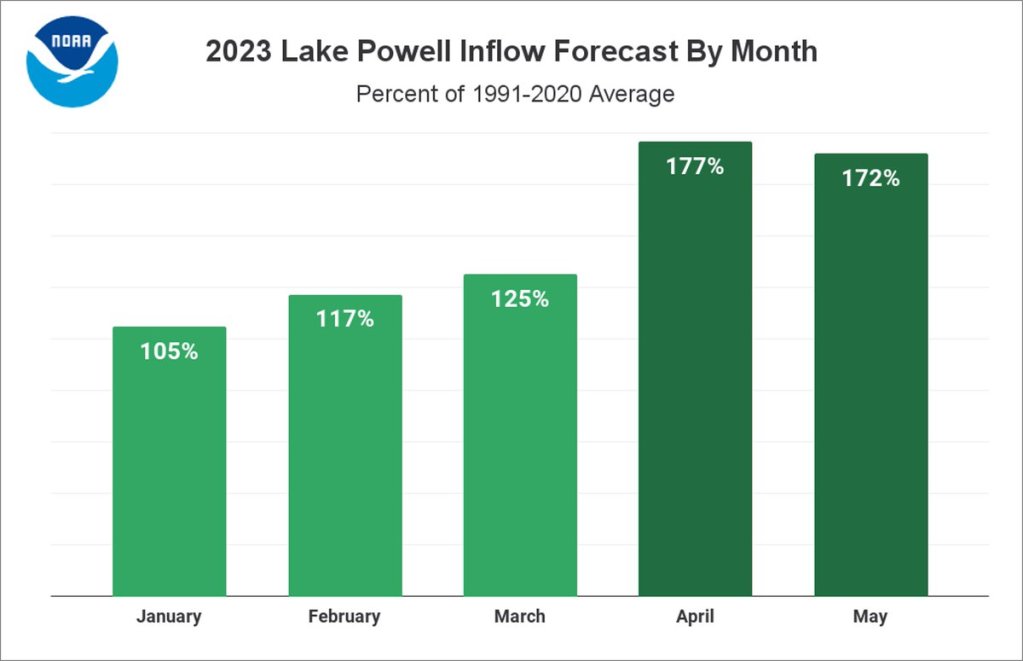 At 3,576 feet, Powell would still remain 124 feet below full pool, holding just 39% of its capacity. This yearโs bounty doesnโt put an end to the crisis on the Colorado River, which supplies 40 million Westerners and irrigates 5 million acres, but it buys Utah and the six other basin states time to find a lasting solution to the riverโs chronic deficits. It may even rescue boating this summer at Lake Powell, among Utahโs top recreation draws, where most of the ramps are high and dry and marinas are unusable…This year, the Bureau plans to increase releases from Glen Canyon Dam to 9.5 acre-feet to bring up the level of Powellโs downstream big sister, Lake Mead. Thatโs the maximum amount released under the damโs operating guidelines and 2 million more than what is typically released in a year. The big spike in Lake Powellโs projected โregulatedโ inflows, expected to total 13.2 million acre-feet, has enabled federal river managers to resume the high-flow experiments.
