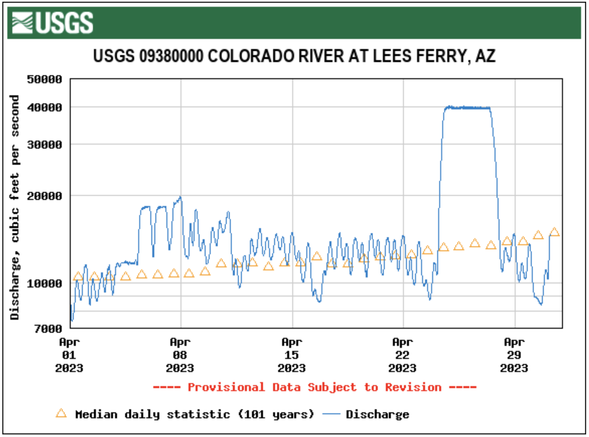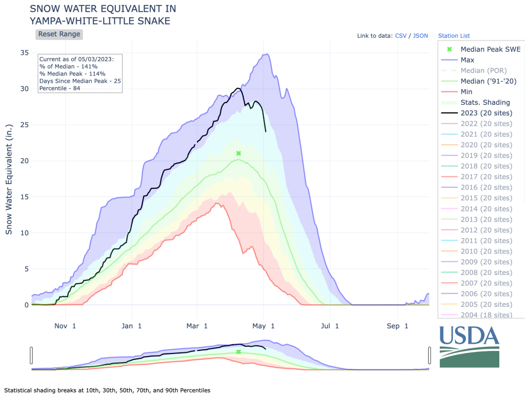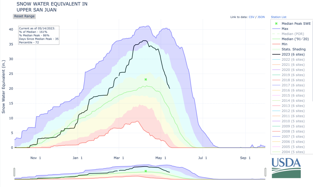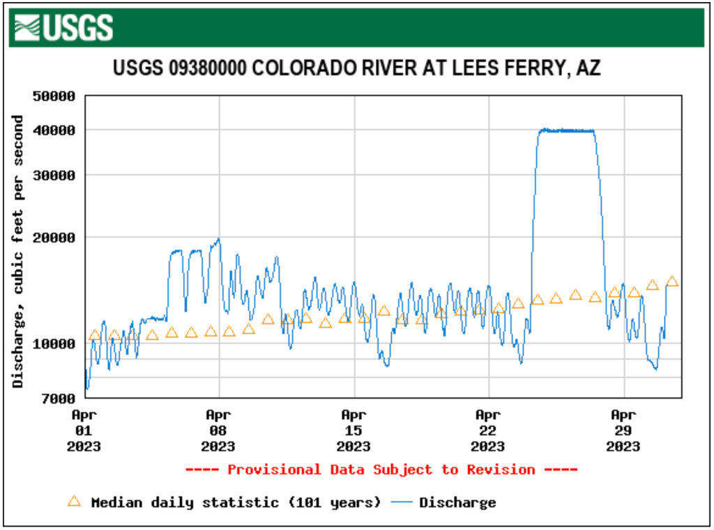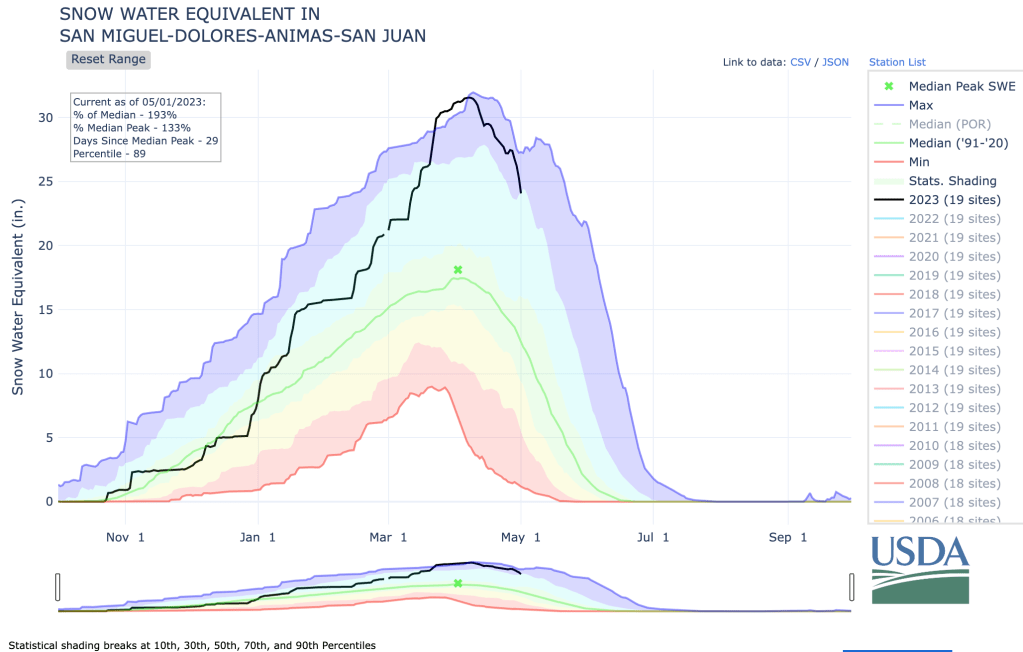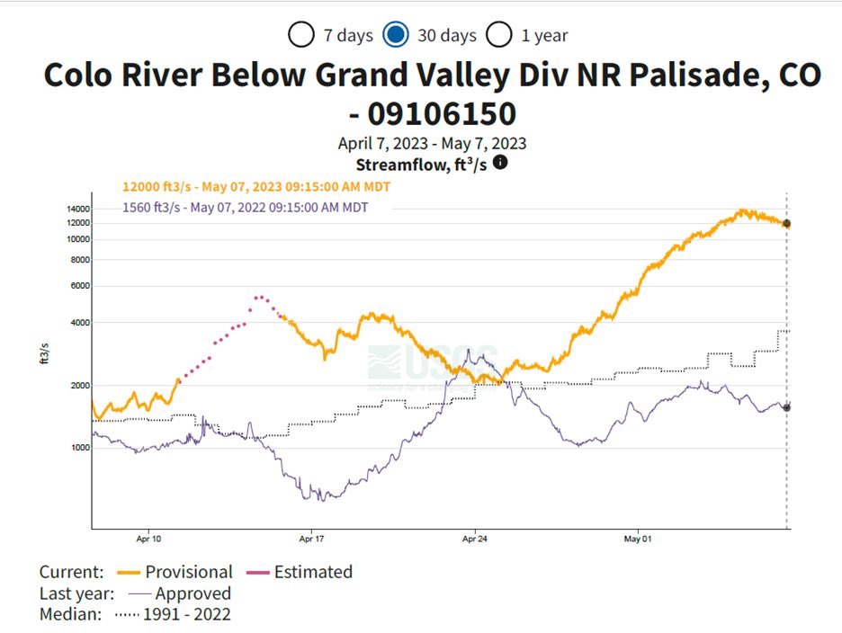 The ramp up for the spring peak operation has been paused as flows on the Gunnison River at Whitewater are already above the spring peak target flow. Flows on the Gunnison River at Delta are close to the flow level that could impact the Delta Wastewater Treatment Plant. Currently Crystal Reservoir is spilling with a total release of 5,300 cfs. Flows in the Gunnison River through the Black Canyon are 4,600 cfs.