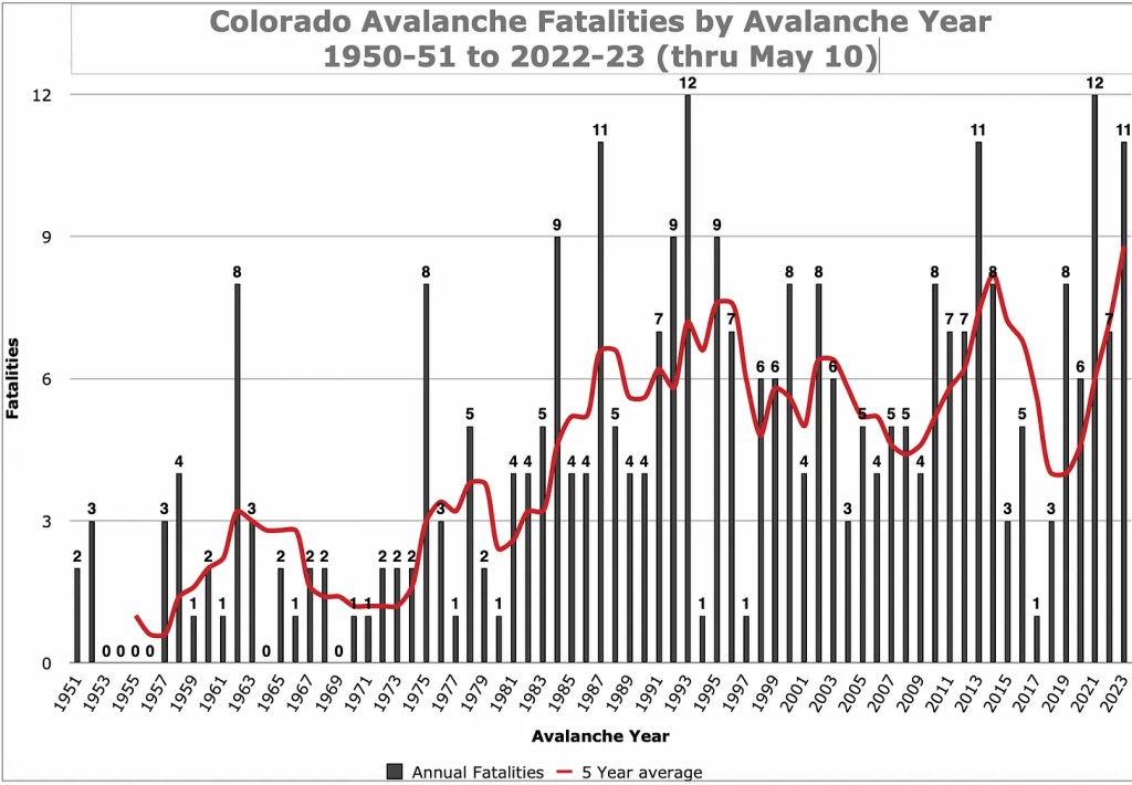 โฆ Avalanches: Twenty-five people have been killed by sliding snow in the U.S. so far this season, with 12 of the fatalities coming in March, April, and May. Eleven of the fatalities were in Colorado, making this season among the stateโs deadliest since 1951. While the big snow may have contributed to the high numbers, it should be noted that the deadliest avalanche year was 2020-21, when the snowpack was generally pathetic. The number of fatalities in any given year are more likely a function of the number of people in the backcountry combined with the snowpackโs stability, no matter how much of it there is.