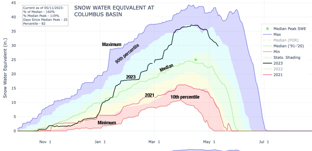 Under a plan approved in 2012, the bureau had been conducting high-flow experiments almost annually until 2018. Since then, a string of dry years and excessive water use have depressed levels of Lake Powell, which today is only 23% full, sitting at 3,525 feet above sea level. That is about to change drastically in the coming weeks as the upper Colorado basinโs snowpacks, which are 157% of normal, melt and flow into Powell and upstream reservoirs. The lake level is projected to climb by more than 50 feet this year, according to Bart Leeflang, the CRAUโs hydrologist…What happened in those months was a big snowpack getting bigger, holding twice as much water in some places as normal for this time of year, coming after back-to-back years of skimpy snow accumulations. According to Bureau projections, the lake level is expected to peak in July at 3,591 feet, 71 feet above its historic low recorded April 13…