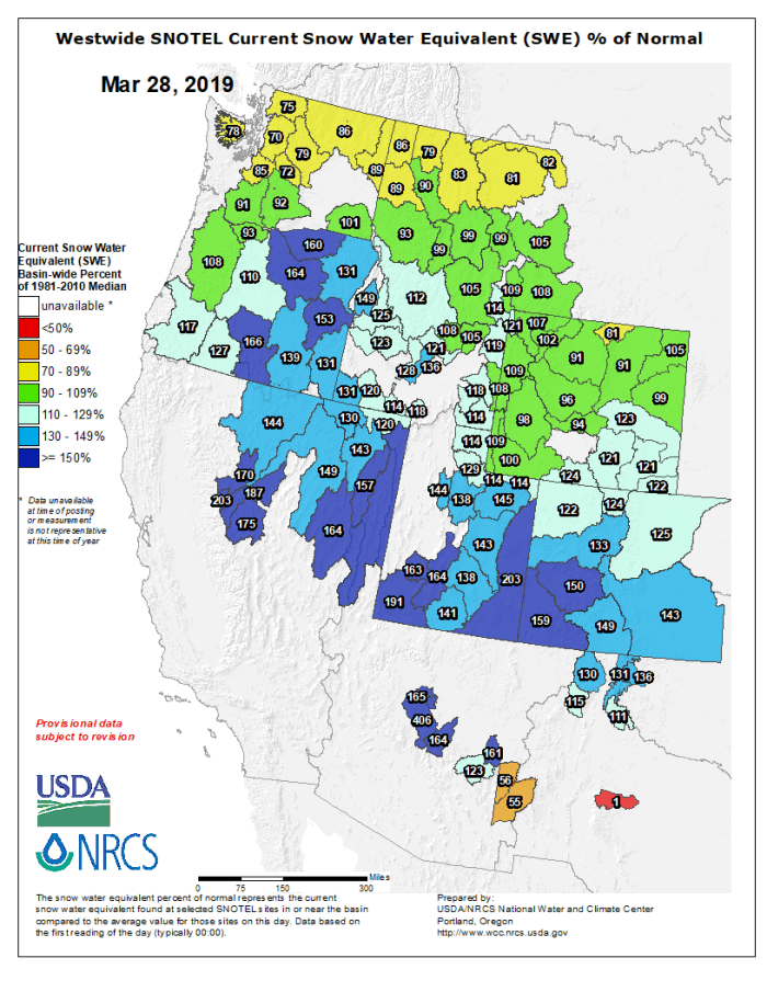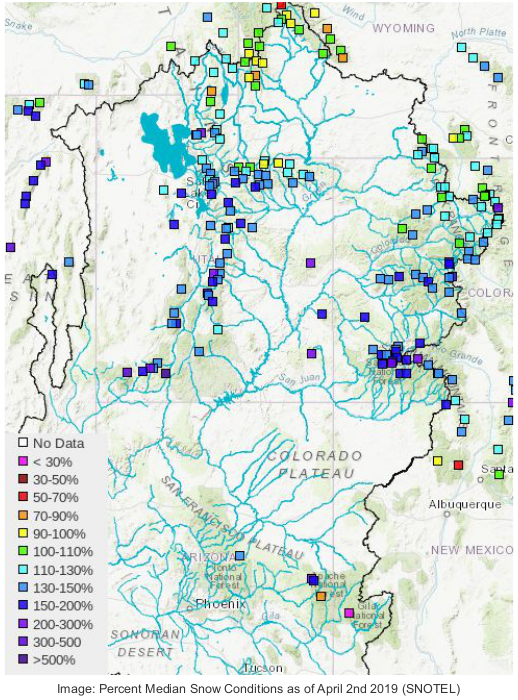 The image below displays the SNOTEL sites as a percent of their historical median as of April 2nd 2019. Those sites in the dark blue currently exceed 150 percent of median (or normal) for this time of year while those in the dark purple are at 200 percent or more of normal.