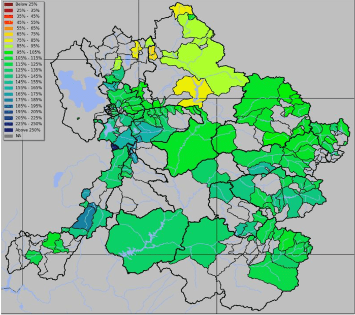 Much above normal (median) snow conditions exist across much of Utah and western Colorado and are generally higher in locations farther south. Currently, the only basin that does not have above normal snow is the Upper Green River in Wyoming which is near normal overall.