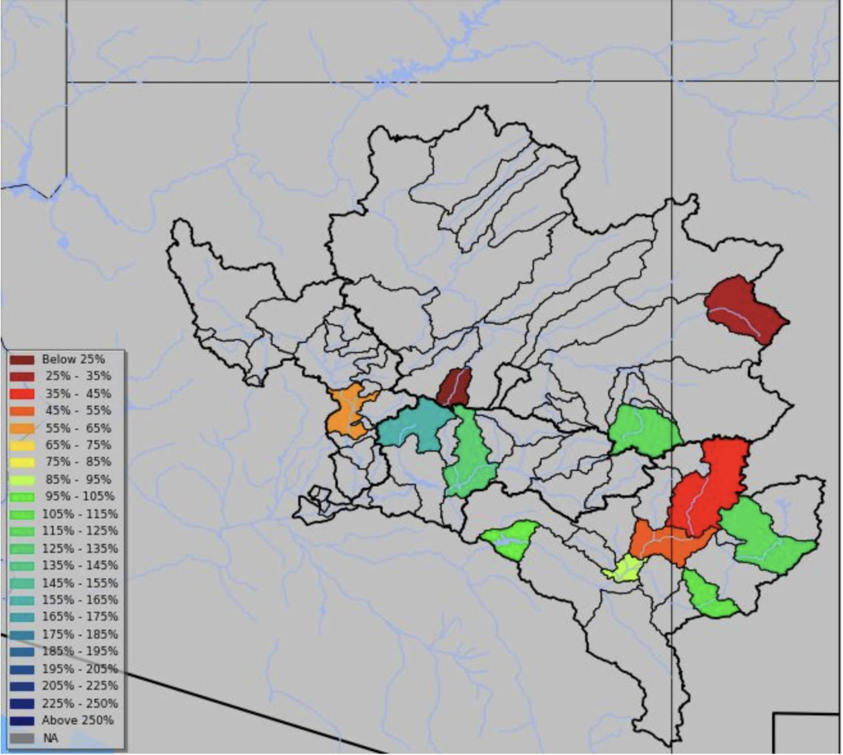 much of Utah and the Upper Colorado Headwaters, 130-200% of average was observed. In general, the only area that saw below normal monthly precipitation was the Green River Basin of Wyoming. Over Arizona, precipitation was mostly near to slightly above normal but increased to much above normal in the Gila River Basin and eastern Salt River Basin. The combination of two successive very wet months across much of the Colorado River Basin (particularly Utah/Colorado) has dramatically improved seasonal snowpack and resulting water supply forecasts…