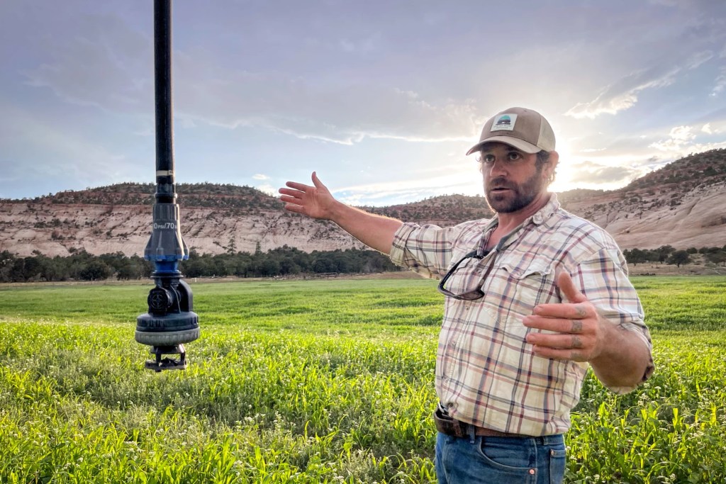 Andy Rice explains how the irrigation system updates at his southern Utah ranch have changed the way he uses water on Aug. 21, 2024. David Condos/KUER