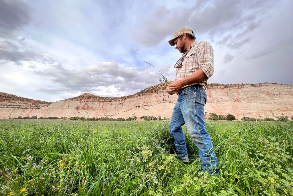 Rancher Andy Rice picks a handful of plants from one of his pastures in southern Utah on Aug. 21, 2024. His ranch is part of a state program aimed at conserving water that helps cover the cost of modernizing irrigation equipment. David Condos/KUER