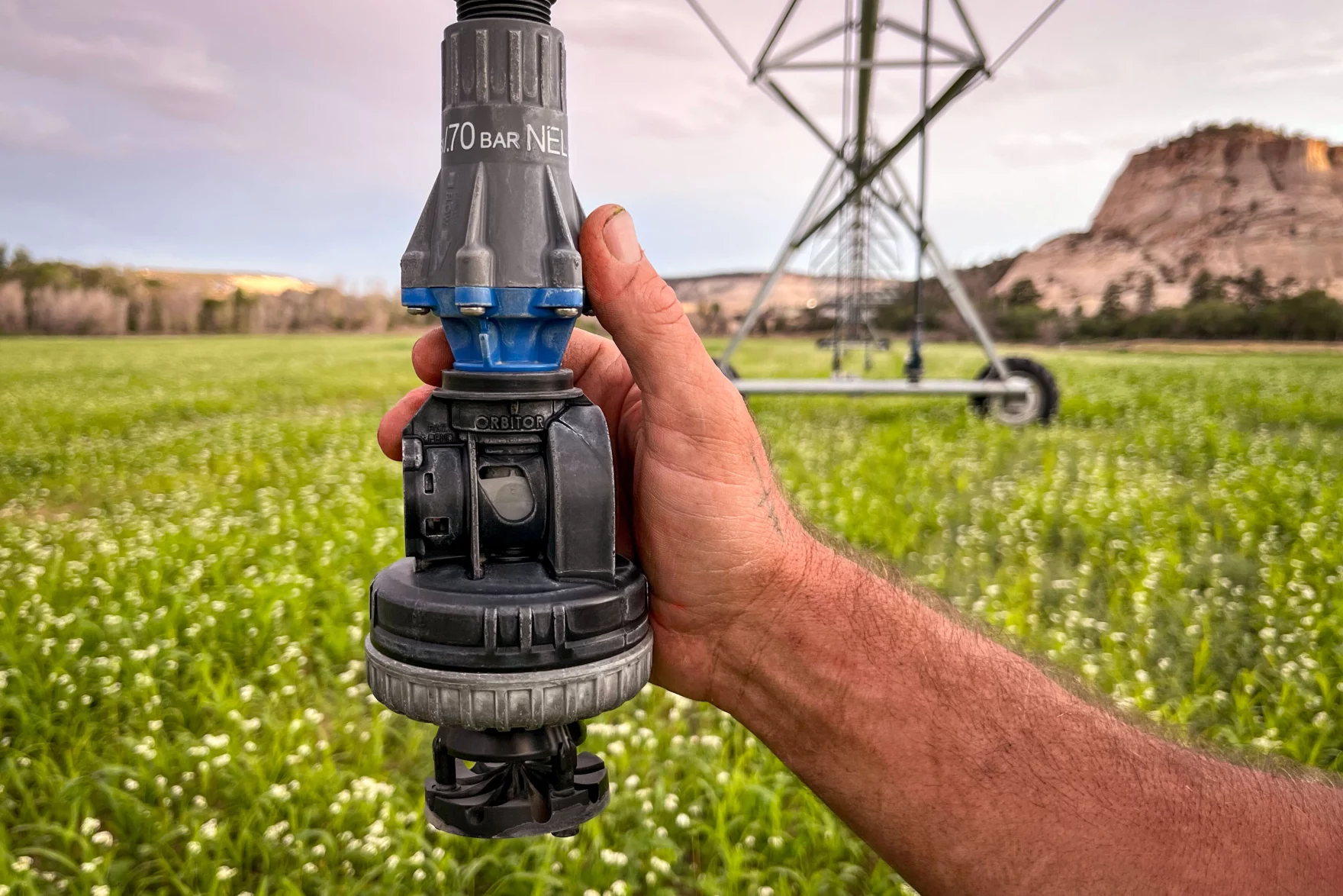 Andy Rice holds one of the nozzles on a center pivot sprinkler system his ranch was able to install thanks to state money, on Aug. 21, 2024. Utah’s Agricultural Water Optimization Program has put millions of dollars into helping farmers and ranchers modernize their irrigation systems since 2019. David Condos/KUER