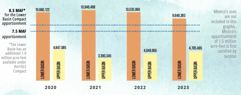 Despite dabbling in these pilot conservation programs, Upper Basin water managers have resisted calls for cuts, saying their water users already suffer shortages in dry years and blaming the plummeting reservoirs on the Lower Basin states (California, Nevada and Arizona). Plus, the Upper Basin has never used its entire allocation of 7.5 million acre-feet a year promised to it under the 1922 Colorado River Compact, while the Lower Basin uses more than its fair share.