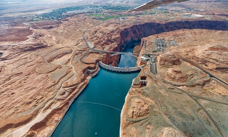 Glen Canyon Dam just upstream from Lee’s Ferry where the Upper Basin ends and the Lower Basin begins. Colorado, New Mexico, Utah and Wyoming, which make up the Colorado Riverโs upper basin, launched the System Conservation Pilot Program late last year, offering money to farmers and others willing to forgo their water use this year. So far the program has struggled, with few people applying. The granted applications amount to less than 2% of the smallest amount of water federal officials hope to save throughout the entire Colorado River Basin. Photo credit: Simon Morris
