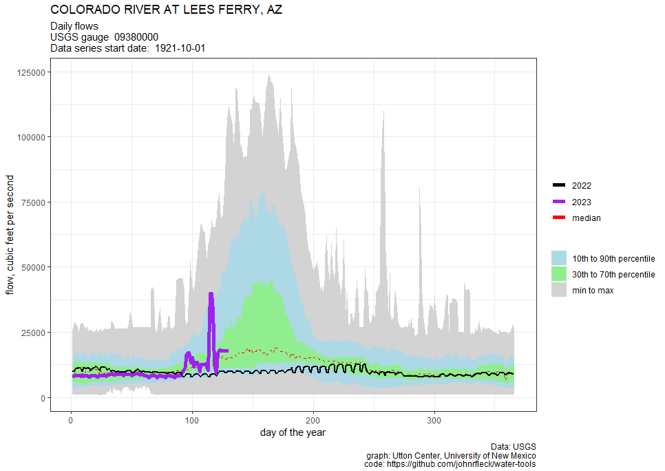 Graph showing increased flow this year on the Colorado River at Lees Ferry gauge. Credit: John Fleck: Utton Center University of New Mexico