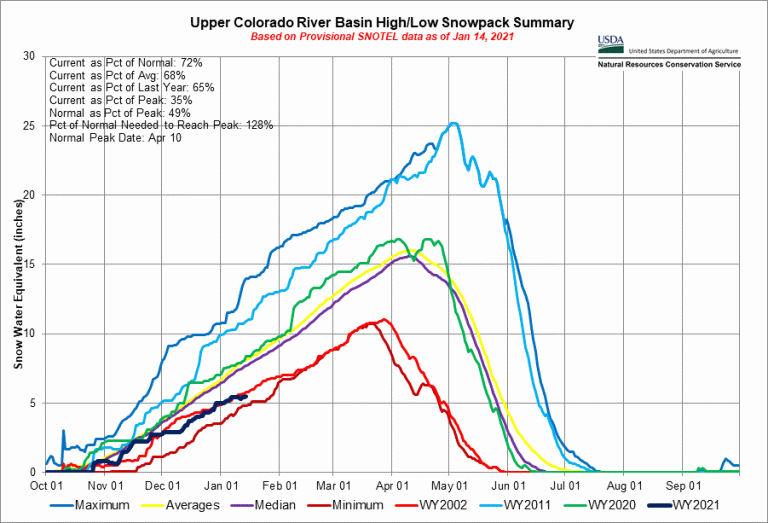 Upper Colorado River River Basin High/Low graph January 14, 2021 via the NRCS.