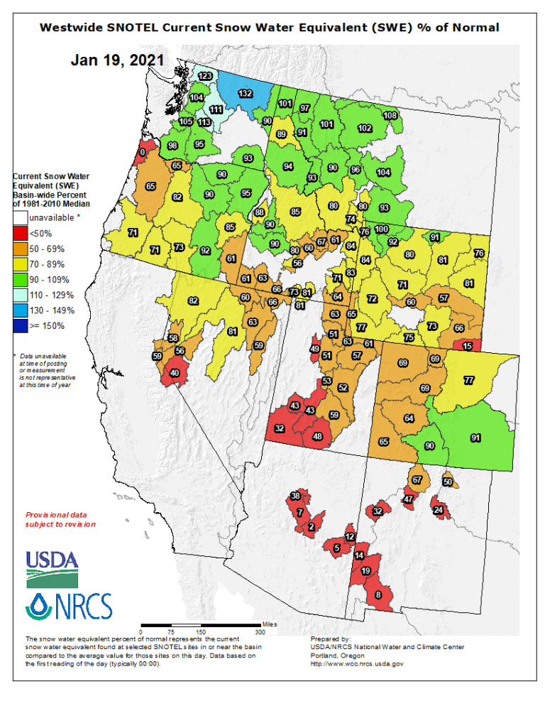 Westwide SNOTEL basin-filled map January 19, 2021 via the NRCS.