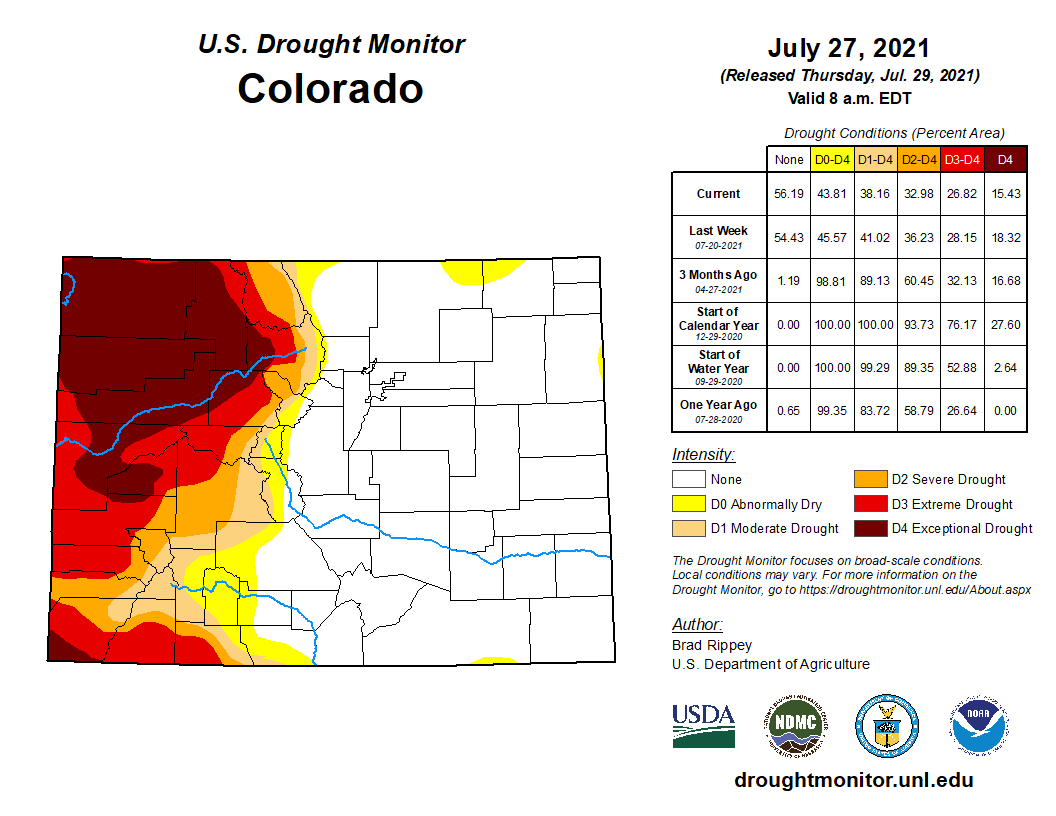 Drought and long, hot summer days are sucking Western Colorado’s rivers dry, parching farm fields and fueling the massive wildfires proliferating across the region. A chunk of northwestern Colorado in the last week plunged into exceptional drought — the most dire category recorded by the U.S. Drought Monitor. The swath of affected land represents 7% of the state and covers most of Garfield and Rio Blanco counties, as well as parts of Moffat, Mesa, Delta, Routt and Pitkin counties…Exceptional drought is expected to occur once every 50 years, [Russ] Schumacher said. So far this summer, the afternoon monsoon rains that provide relief have been largely absent from the Western Slope. The higher-than-normal temperatures and a lack of rain have sapped the rivers in the Western half of Colorado. Streamflows statewide are at only half of the median recorded between 1991 and 2020, according to National Water and Climate Center data. The lack of water has limited fishing and rafting opportunities, reduced agricultural irrigation and threatened river environments…Nearly half of Colorado is experiencing some level of drought, according to new data released Thursday by the U.S. Drought Monitor. More than 1.4 million people live in that drought-impacted area, which encompasses the entire western half of the state, parts of metro Denver and some areas of southern Colorado…