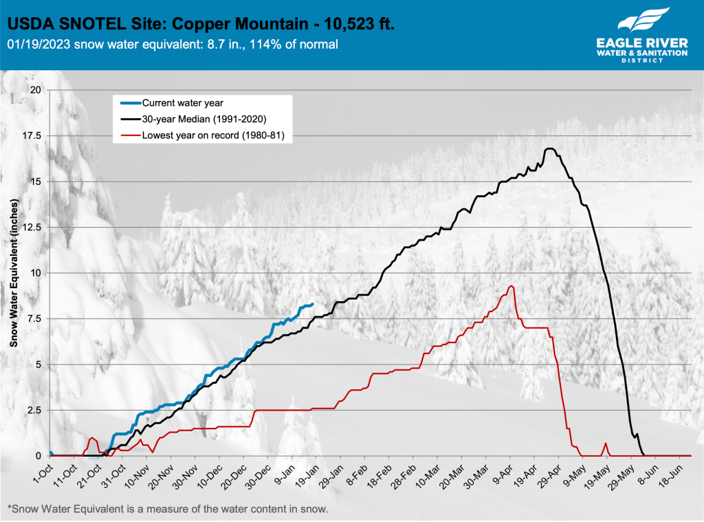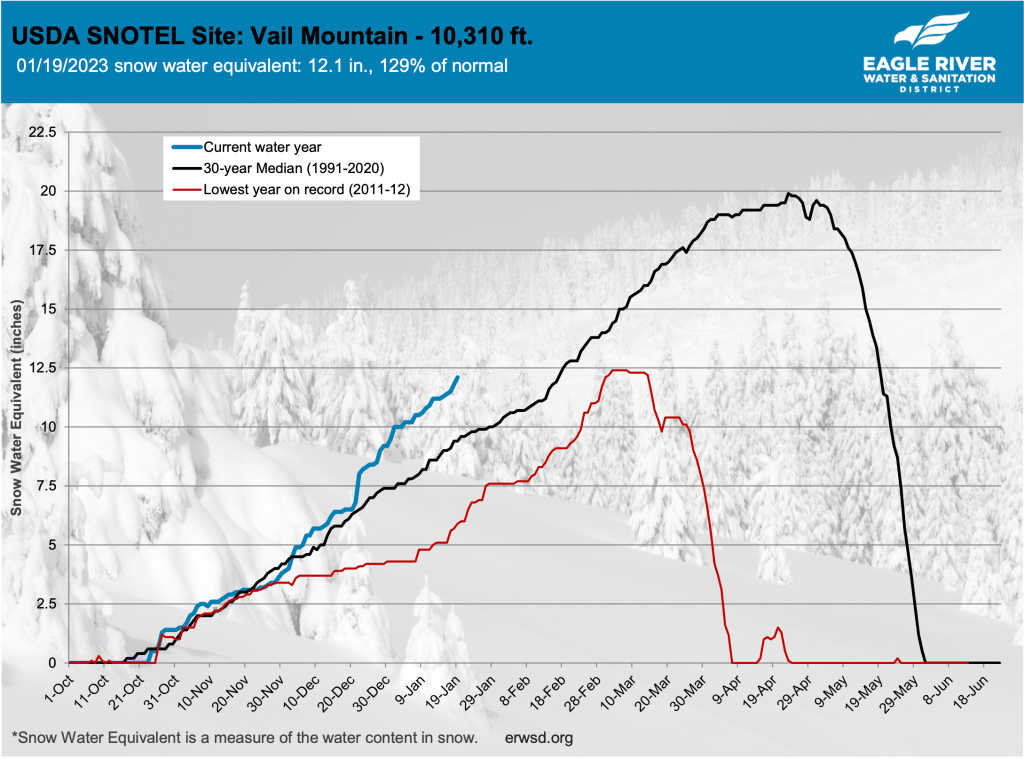 According to the latest numbers from U.S. Department of Agriculture’s measurement sites at Vail, Copper Mountain and Fremont Pass, the snowpack, as measured in “snow water equivalent,” is 90% or less of the 30-year median. Copper Mountain is the closest measurement site to Vail Pass, and Fremont Pass is the closest measurement site to the headwaters of the Eagle River. Vail Mountain’s measurement is the lowest of the three, at 76% of the 30-year median…