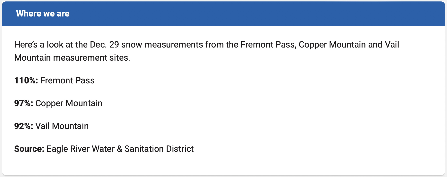 [Vail Mountain Chief Operating Officer Chris Jarnot] said snowfall measured at the top of the mountain puts this year just outside of the top five best years as of Wednesday, but it’s not an apples to apples comparison to previous seasons because the timing of when the resorts starts measuring snow for the season has been different throughout the years. This season is the best snow year since the resort started measuring at Mid-Vail 10 years ago, he said.