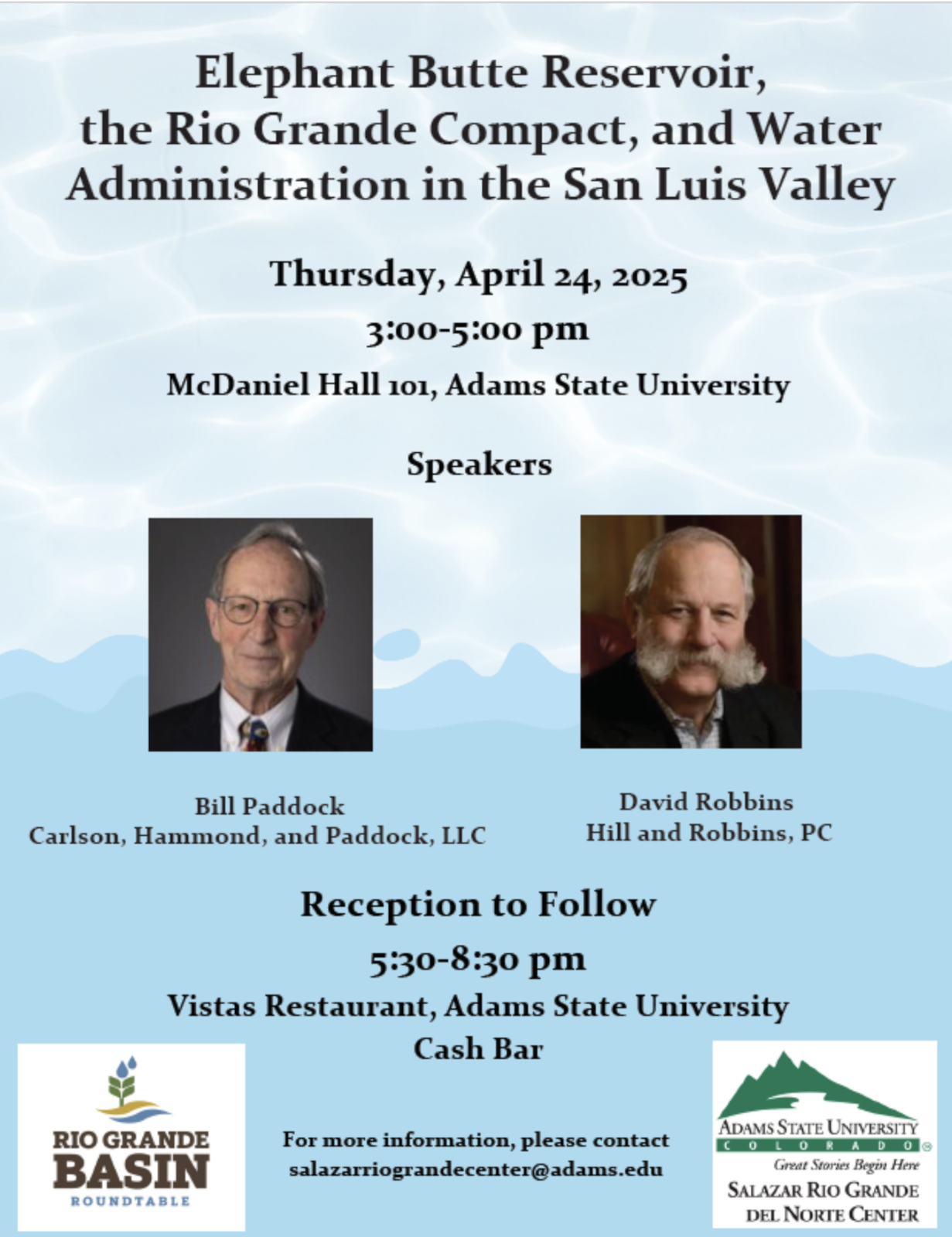 | Join Colorado attorneys Bill Paddock and David Robbins as they present “Elephant Butte Reservoir, the Rio Grande Compact, and Water Administration in the San Luis Valley” on Thursday, April 24, 2025, from 3:00 p.m. to 5:00 p.m. in McDaniel Hall 101 at Adams State University. Paddock and Robbins have worked for many decades protecting water interests in the San Luis Valley and throughout Colorado. Their perspectives will provide timely insights into the 1938 Rio Grande Compact, how it shapes current river management in the San Luis Valley and the broader river basin, and last year’s Supreme Court ruling on Texas v. New Mexico and Colorado. The presentation will be followed by a free reception from 5:30 p.m. to 8:30 p.m. at Vistas Restaurant in Rex Stadium on the Adams State campus sponsored by the Rio Grande Water Conservation District, the San Luis Water Conservancy District, and the Conejos Water Conservancy District. These events will be held in conjunction with the Rio Grande Compact Commission meeting on Friday, April 25, 2025 starting at 9:00 a.m. at the Rio Grande Water Conservation District office in Alamosa. This annual meeting brings together officials from Colorado, New Mexico, and Texas to discuss river policy and management. The meeting is free and open to the public. For more information about the April 24th events, please contact Salazar Center director Paul Formisano, Ph.D., at pformisano@adams.edu. |