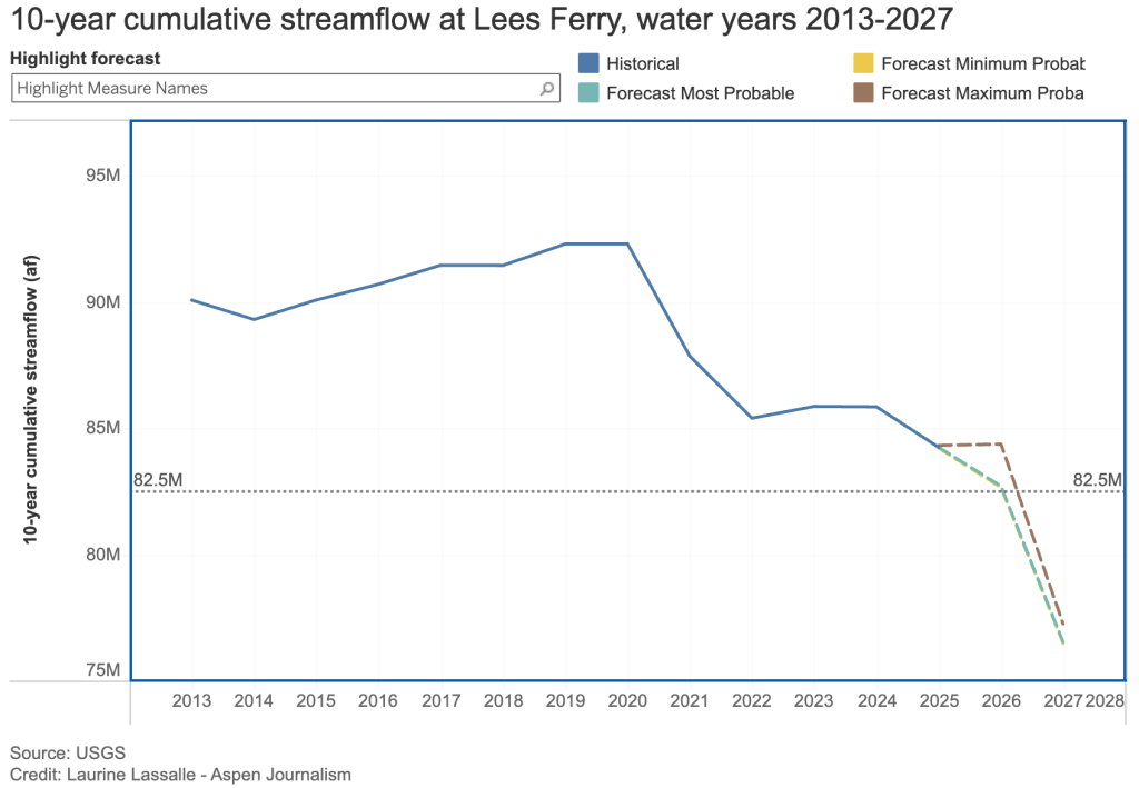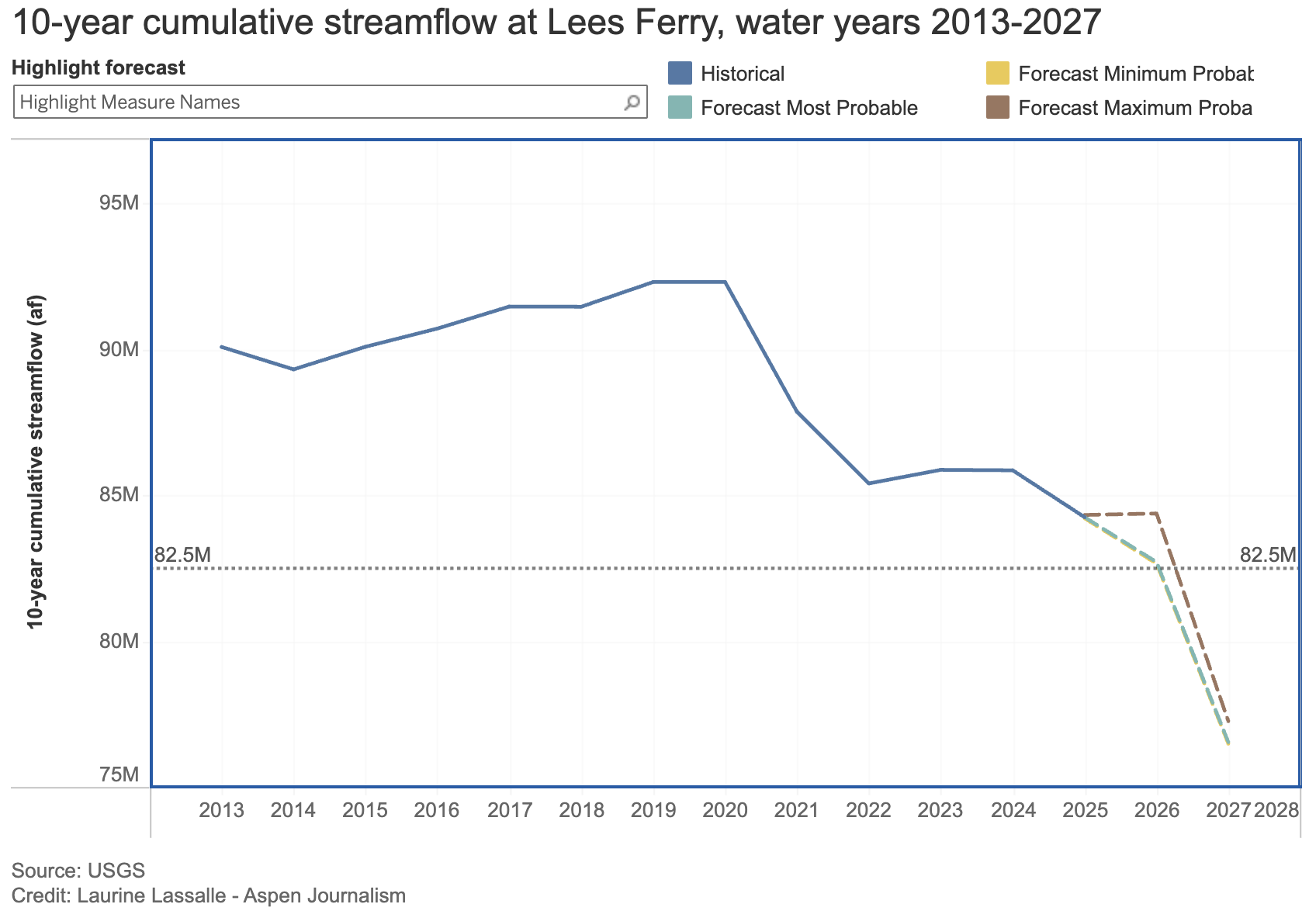 Colorado River expert Eric Kuhn says that the latest report from the U.S. Bureau of Reclamation is a major caution sign for the basin. An anemic snowpack this past winter could be setting the basin on the road to a compact call (as defined by the Lower Basin). The most recent federal forecast predicts that in 2027, the 10-year cumulative flow at Lee Ferry could drop below 82.5 million acre-feet, a threshold Kuhn calls the first “tripwire” for a compact call.