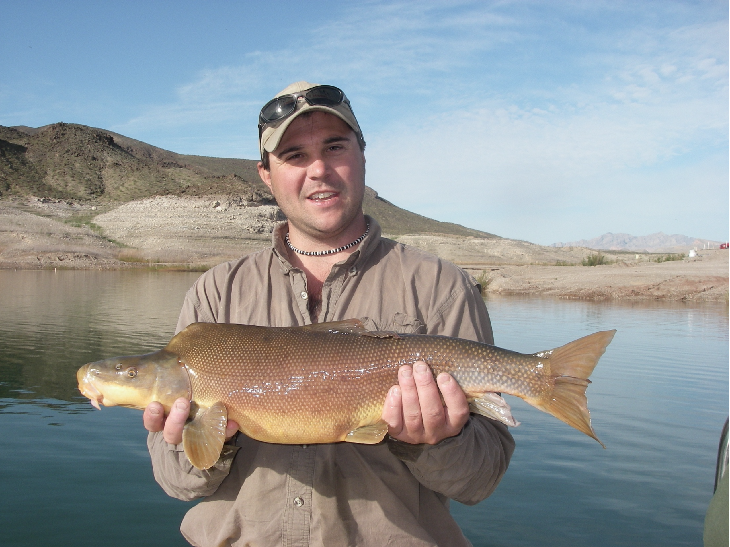 Ron Rogers biologist with Bio-West Inc., holds a large razorback sucker captured in Lake Mead near the Colorado River inflow area