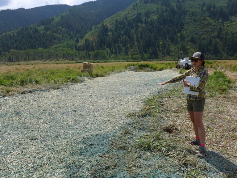 The wetland plug is 130 feet long, and composed of a mixture of local and imported soil, hydromulch, straw, native seeds and erosion mats. The restoration team later added wattles across the plug, and they hope to engage the community in planting native sedges and rushes across the top of the plug this spring. Photo credit: Heather Sackett/Aspen Journalism