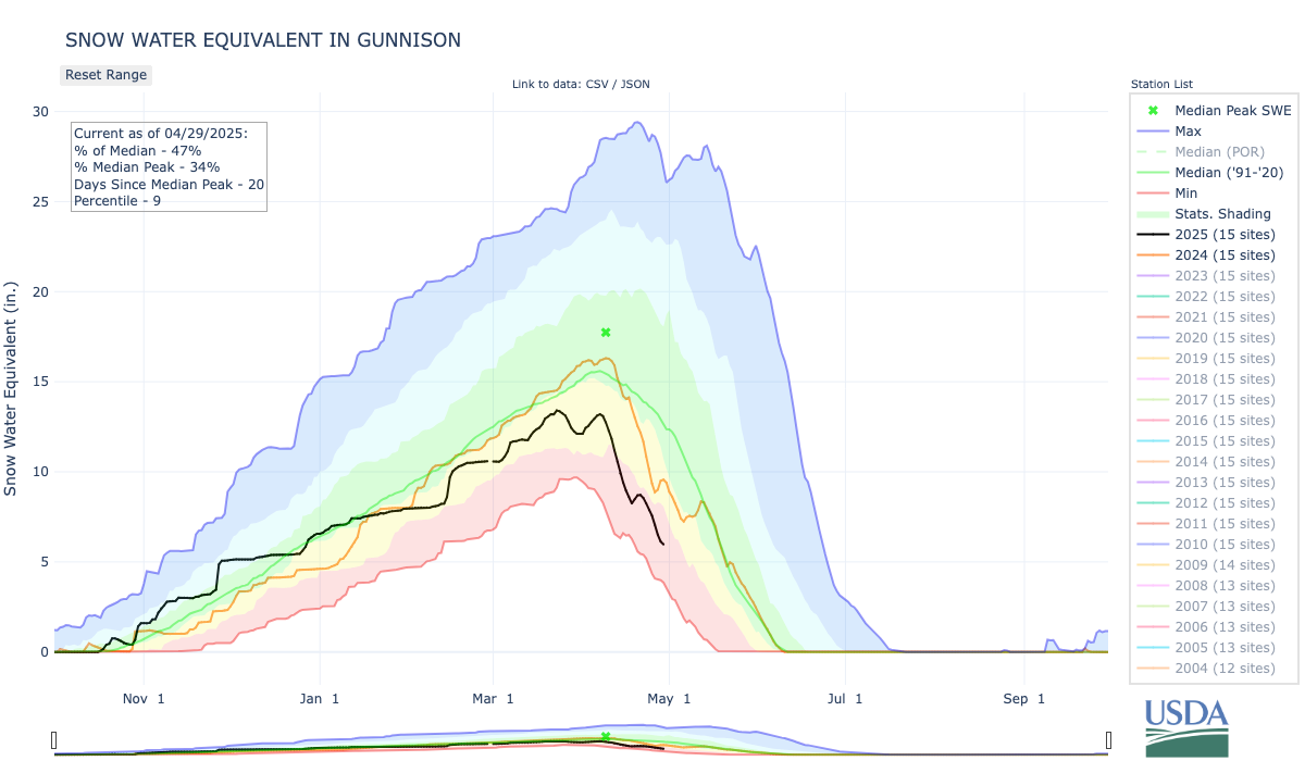 Snowpack across the Gunnison River Basin is below normal, particularly in the East River Basin where the predicted streamflow for the April through July runoff season is 78 percent of normal.