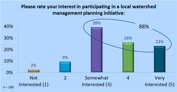 Agricultural producers want to engage on local water-related planning activities. Colorado Cattlemen’s Ag Water NetWORK’s 2019 state-wide survey of agricultural producers found almost one-fourth of respondents were “very interested” in participating (see chart). Eighty-eight percent of respondents said they were at least “somewhat interested” in getting involved in local watershed management planning efforts.