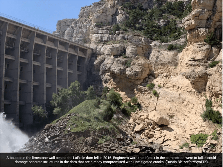 Until somebody noticed a boulder that had apparently tumbled — in 2016 — from the western side of the limestone-walled canyon just below the dam. It struck a dirt mound on the way down and, by luck, rolled away from the dam’s concrete fins instead of toward them, according to engineers’ accounts. Had it landed on the other side of the mound, it would have rolled toward the dam.