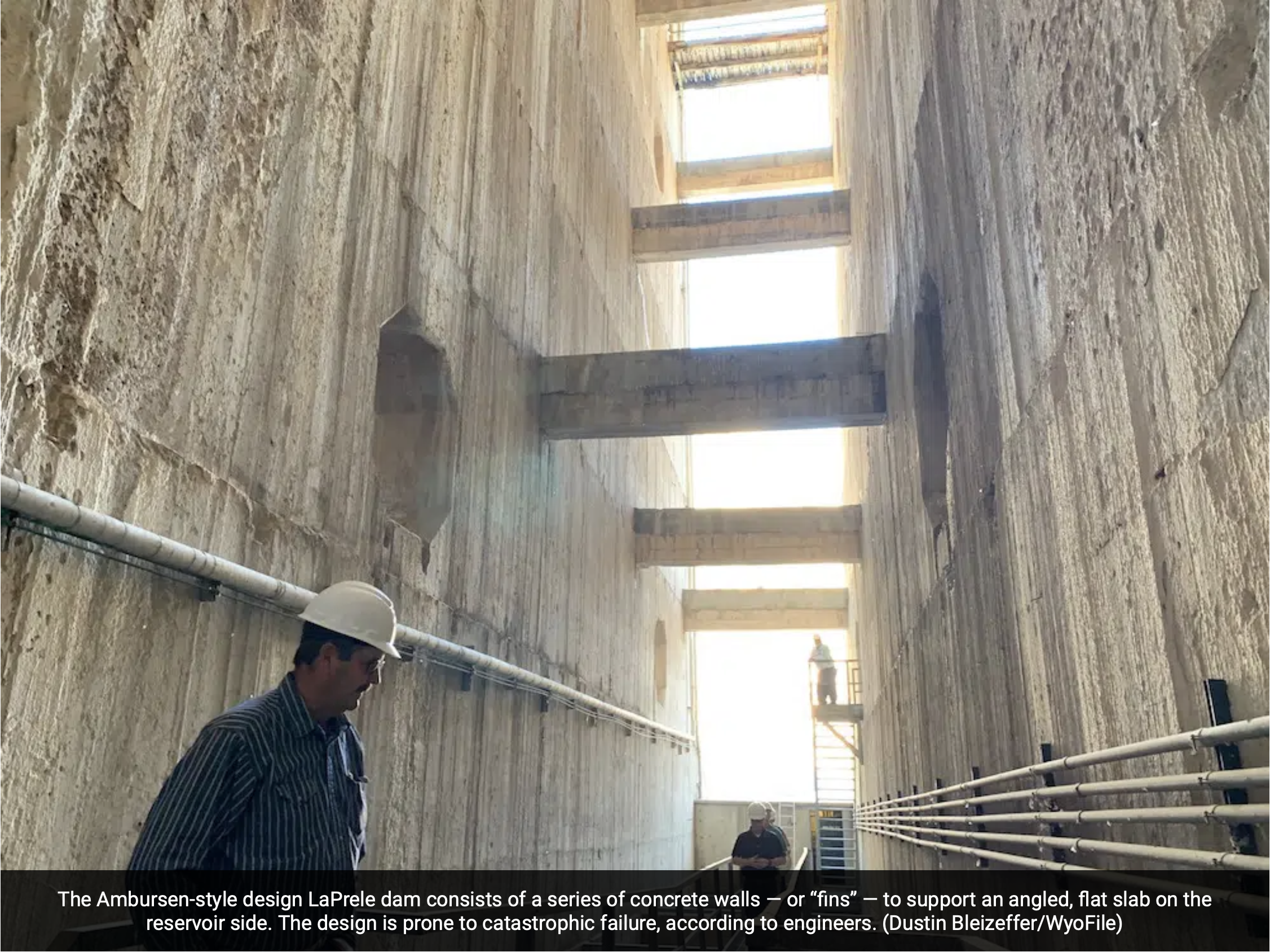 The Ambursen-style design LaPrele Dam consists of a series of concrete walls — or “fins” — to support an angled, flat slab on the reservoir side. The design is prone to catastrophic failure, according to engineers. (Dustin Bleizeffer/WyoFile)