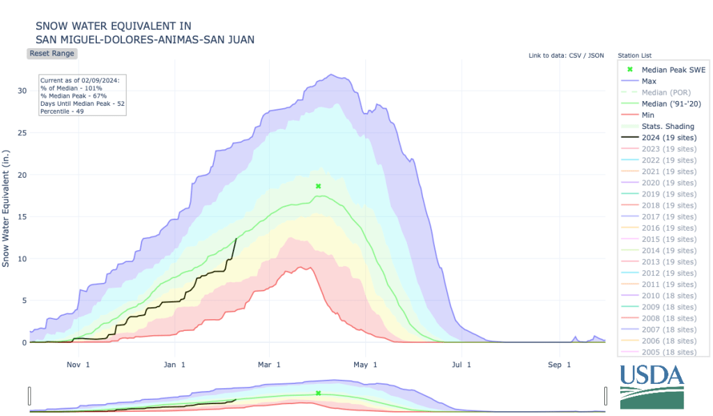 Westwide SNOTEL basin-filled map March 16, 2025 via the NRCS.