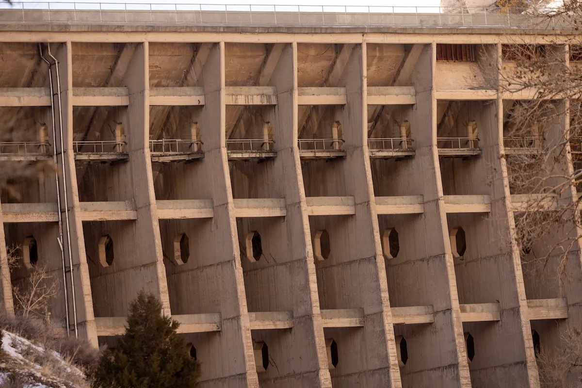 The aging LaPrele Dam is seen in Converse County on Jan. 31, 2025. Late last year, the state ordered the 115-year-old concrete structure to be breached and eventually demolished to avoid possible catastrophic failure. (Dan Cepeda)