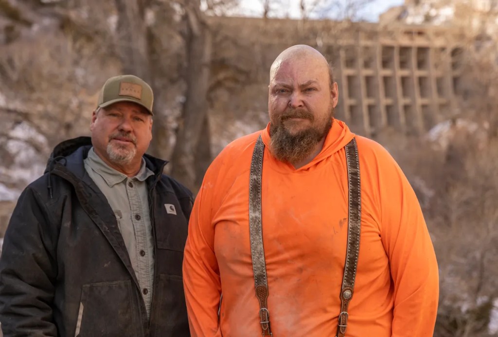 Philip Dziardziel, Vice President of the LaPrele irrigation district board, and Casey Darr, Treasurer of the irrigation district board, pose on a small bridge near the LaPrele Dam on Jan. 31, 2025. They and many locals feel a special connection to the dam, which has allowed generations of families to thrive on the land it protects. (Dan Cepeda)