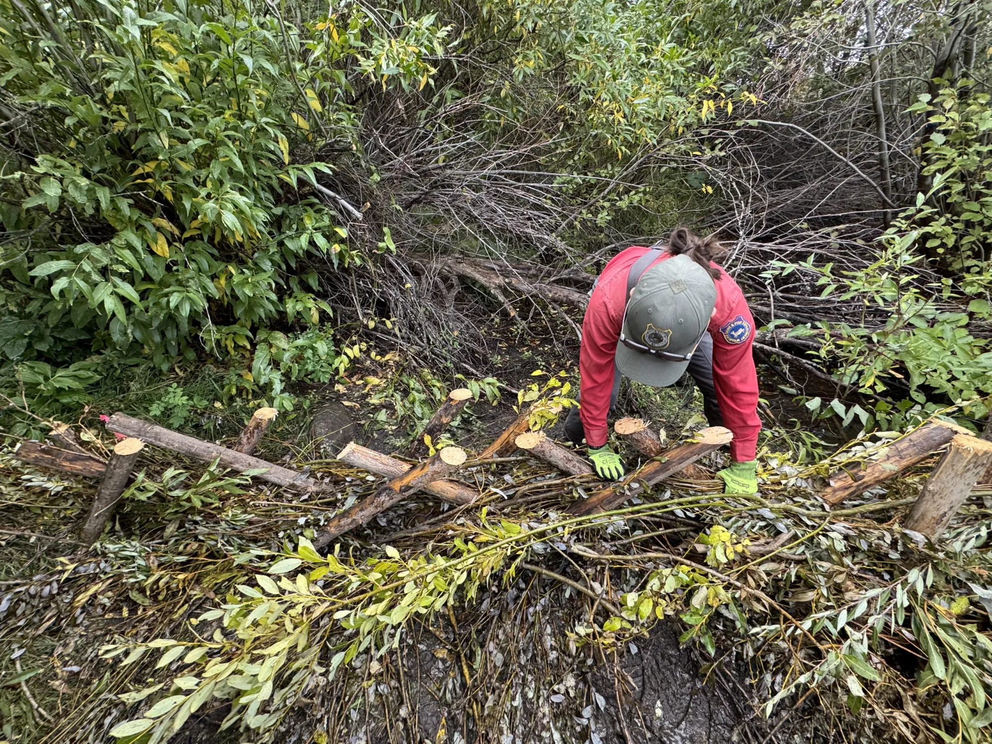 A Wyoming Game and Fish Department herpetology technician pushes willow branches through posts in the South Fork of Lake Creek in the Snowy Range. The willow branches help create a beaver dam analogue, meant to slow water flow and replenish the water table. (Christine Peterson)