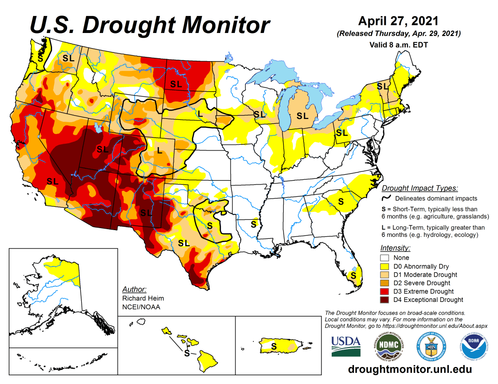 According to the April 27 U.S. Drought Monitor report, 48.4 percent of the contiguous U.S. was in drought, up nearly 4.5 percent since the end of March. Drought conditions intensified and/or expanded across the eastern Great Lakes, Northeast, northern Rockies, northern Plains and the West Coast. Drought intensity and/or severity lessened across portions of the Upper Mississippi Valley, southern Plains and central Rockies.