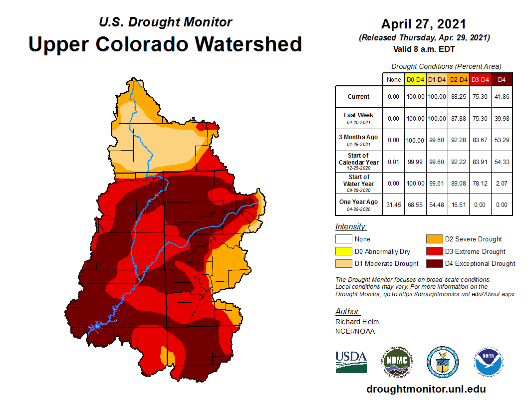 The next water supply forecast will be released in early May and is available at http://nrcs.usda.gov. The Drought Monitor map is published every Thursday and is available online at http://droughtmonitor.unl.edu.