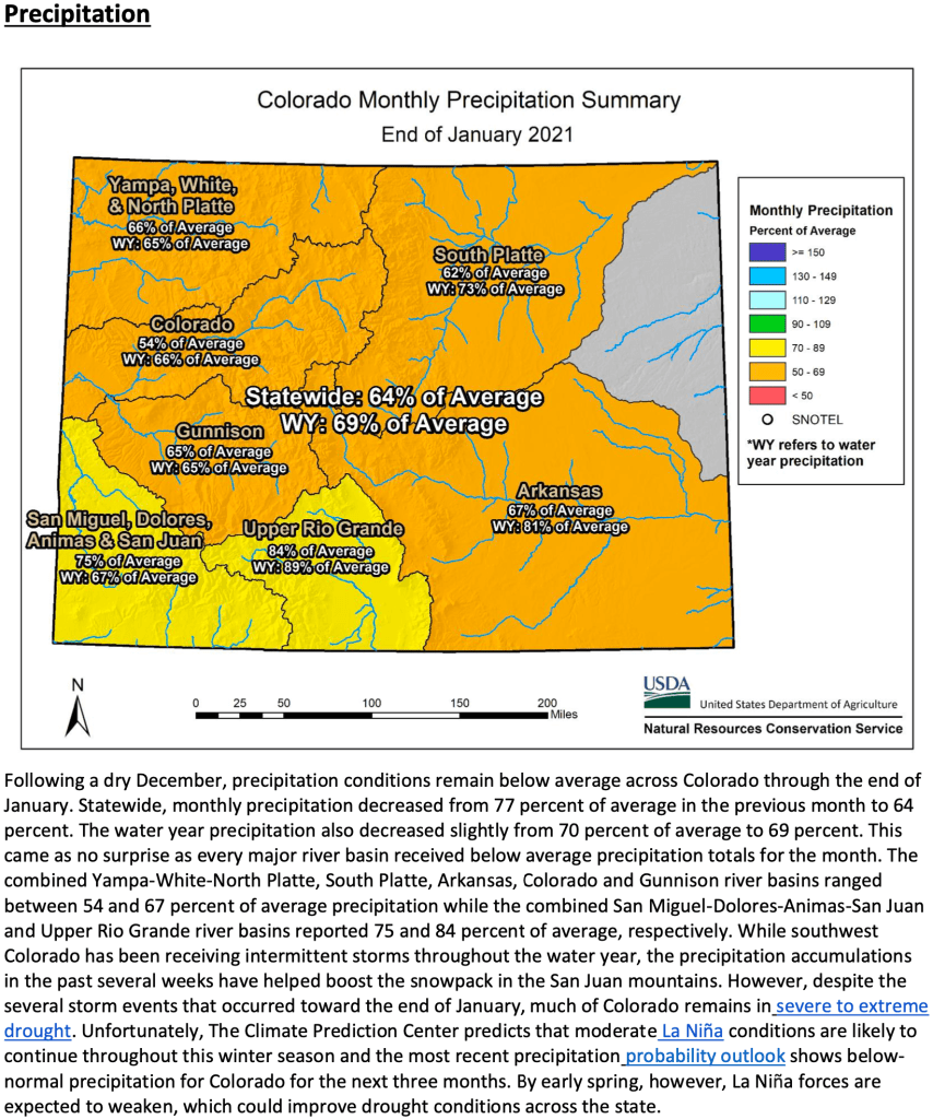 According to the NRCS, reservoir storage at the end of January in the state was at 80% of average for this time of year. The Bureau of Reclamation currently expects runoff into Blue Mesa Reservoir to be at 70% of average between April and July, and for the water level at Blue Mesa to top out this year at 576,000 acre feet, out of a reservoir capacity of 830,000 acre feet…