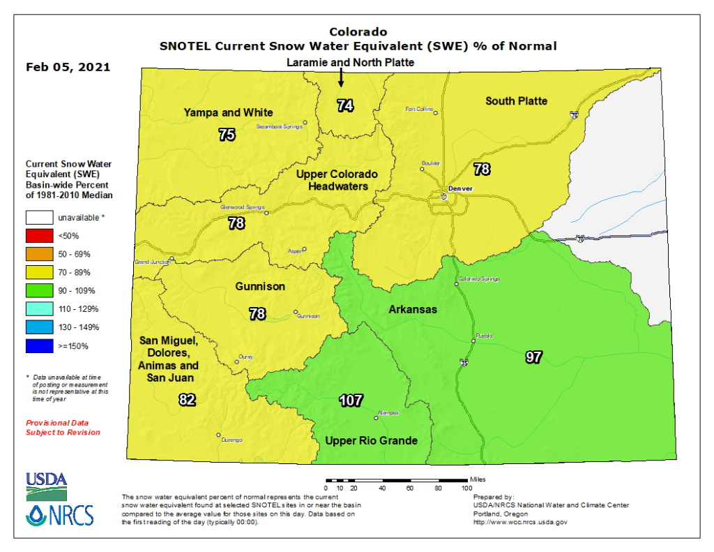 Colorado snowpack basin-filled map February 12, 2021 via the NRCS.