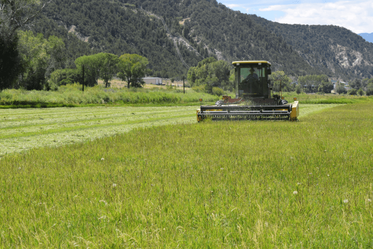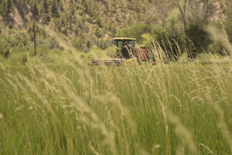 Bill Fales cutting hay near Carbondale last month. This summer’s drought led to a 40% smaller crop than what he would normally harvest at the first cutting of the season. “I’m going to have to sell cows because I just don’t have enough hay and it’s too expensive to buy to feed to cattle,” he says. Photo credit: Laurine Lassalle / Aspen Journalism