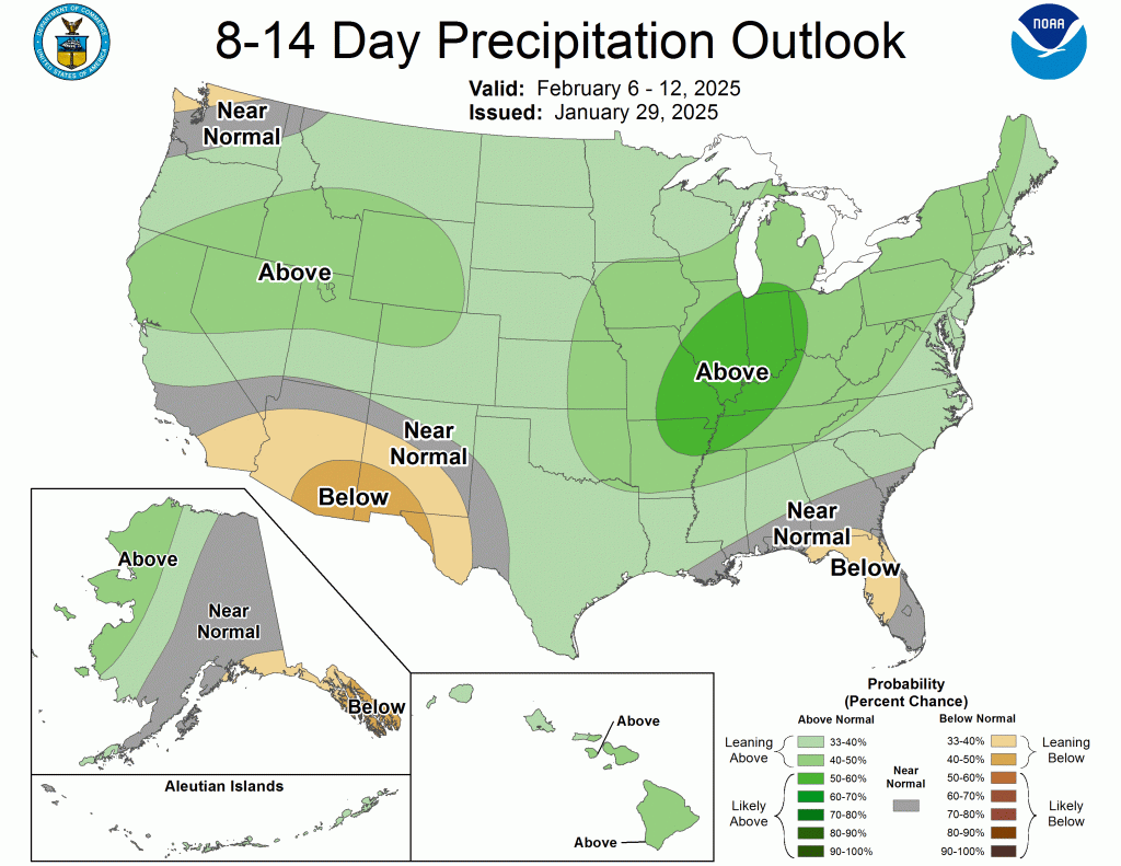 The Climate Prediction Centerโs 6-10 day outlook (valid January 21-25, 2025) favors below-normal temperatures to persist for much of the contiguous U.S. with the largest below-normal temperature probabilities (exceeding 80 percent) extending from the Mid-Atlantic and Ohio Valley south to the Gulf Coast. Elevated above-normal precipitation probabilities are forecast for the northern Great Plains, Gulf Coast, and portions of the Southeast. Below-normal precipitation is favored for the West, Central Great Plains, Midwest, and New England.
