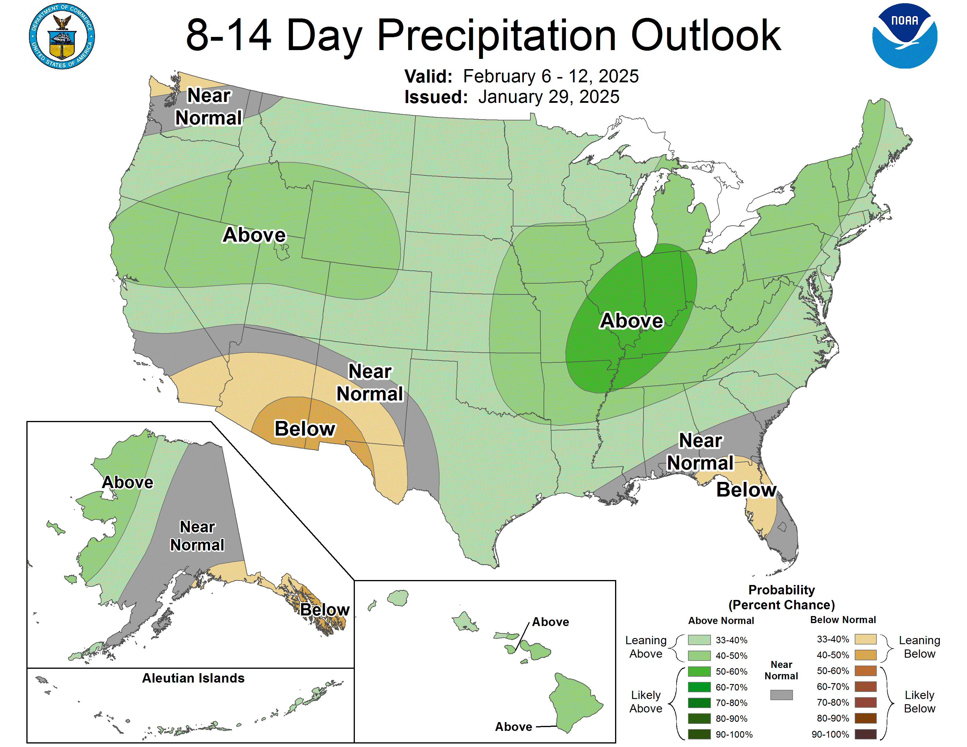 The 6-10 day outlooks show that the probability of below-normal temperatures is greatest in the Pacific Northwest and across the northern part of the United States into the High Plains. The best chances of above-normal temperatures will be over the Four-Corners region and along the southern tier of the U.S. into the Southeast and Mid-Atlantic. The greatest chances of above-normal precipitation will be over northern California into the Great Basin and the northern Rocky Mountains as well as over the Midwest. The best chances of seeing below-normal precipitation are over the Southwest and along the Gulf Coast of Florida.