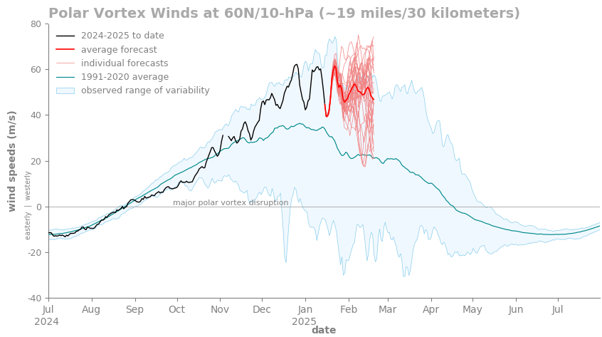 1. The polar vortex strength, as measured by the speed of the winds around the 60N latitude circle and 10 hPa pressure level, remains stronger than average, and is currently forecast by most models to return to near-record strong wind speeds into early February.
