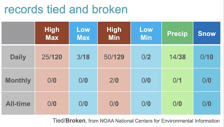 The Colorado Climate Center reported 120 new all-time high temperatures along with 25 tied records. Nights, as Schneekloth noted, were also warm. There were 129 records for the high minimum temperature.