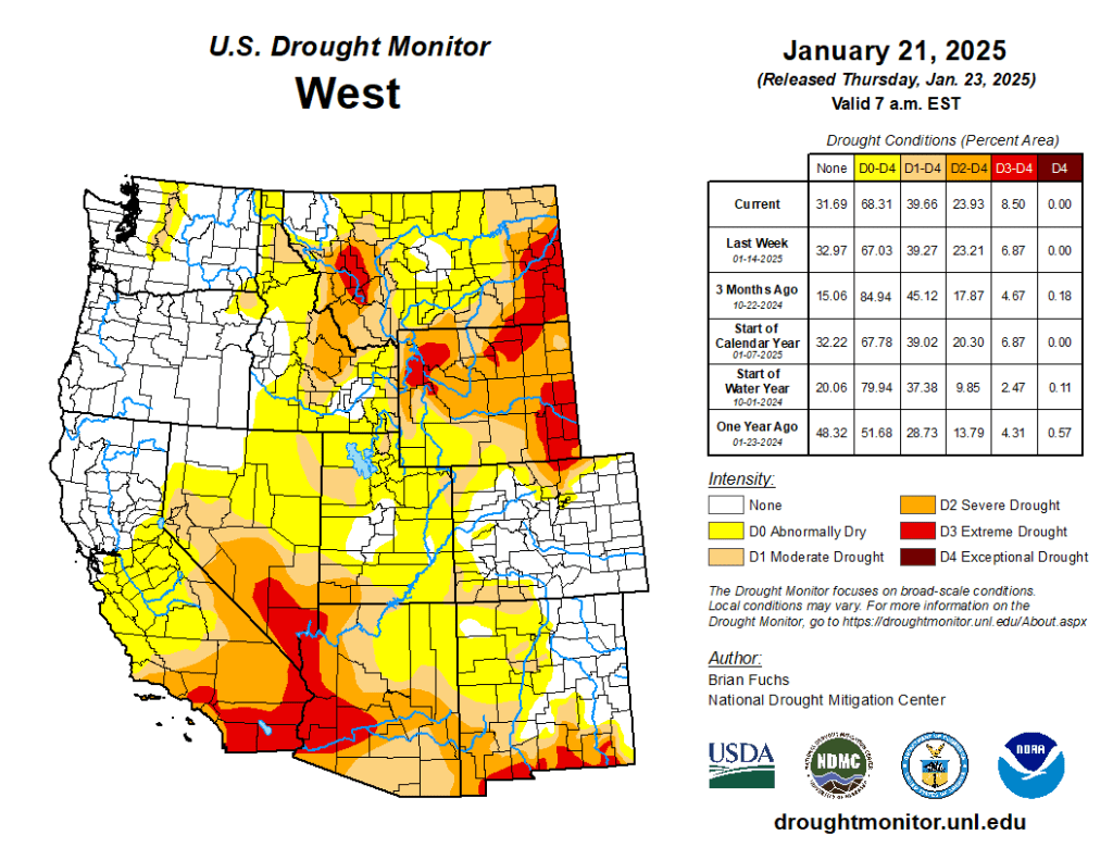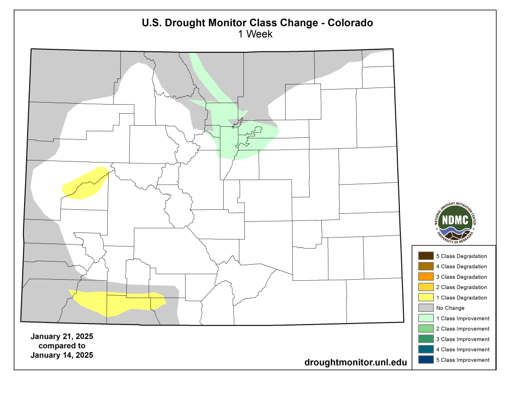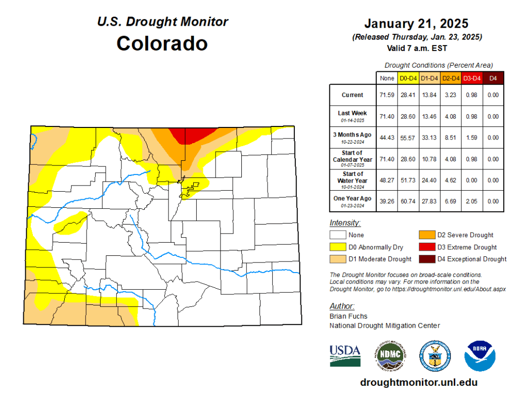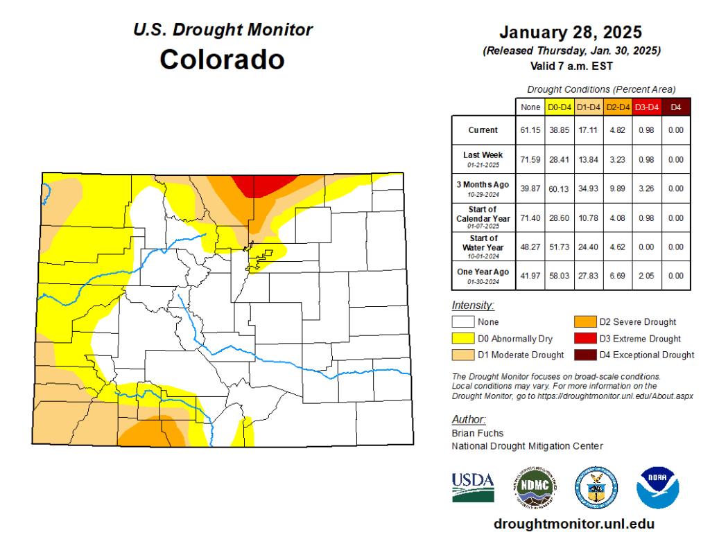 #Drought news January 30, 2025: In #Colorado, abnormally dry conditions and moderate drought expanded over the west, south and southwest portions of the state with a new area of severe drought added in the south