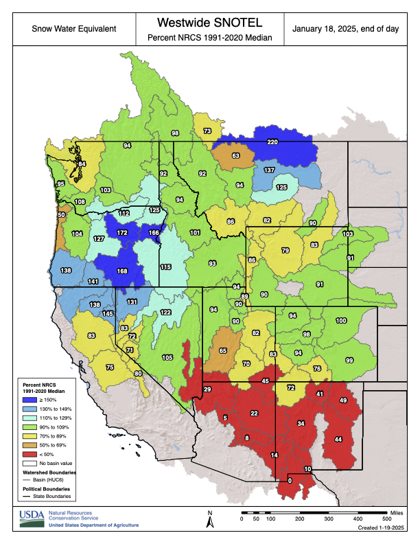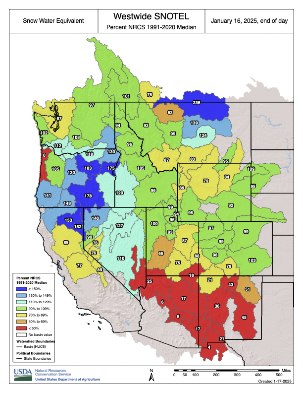 Severe drought (D2) was expanded to include all of southern California due to the very dry start to the water year to date (WYTD) from October 1, 2024 to January 13, 2025. The D2 coverage coincides with where WYTD precipitation has averaged less than 5 percent of normal. [ed. emphasis mine] A number of locations, including San Diego, are having their driest start to the water year. The D2 covers Los Angeles and Ventura counties which are being affected by periodic Santa Ana winds drying out vegetation and large wildfires. Following the two wet winters, the large reservoirs throughout California are at or above-normal. Based on 90-day SPI, declining soil moisture, and low snow water equivalent, a 1-category degradation was warranted for parts of Arizona and southwestern Utah. A mix of improvements and degradations were made to Idaho and the depiction is generally consistent with the 2024-2025 WYTD precipitation and snowpack. Eastern Washington and much of Oregon are drought-free, but low snowpack supports moderate drought (D1) along the northern Cascades of Washington. A 1-category improvement was justified for a portion of central Montana, based on 90-day SPEI along with snow water equivalent (SWE) above the 75th percentile. As of January 14, SWE was above-normal (period of record: 1991-2020) across the southern Cascades along with eastern Oregon and southwestern Idaho. SWE varies for the Sierra Nevada Mountains, those numbers are beginning to decrease after a drier-than-normal start to January. SWE remained well below-normal across the Four Corners Region…