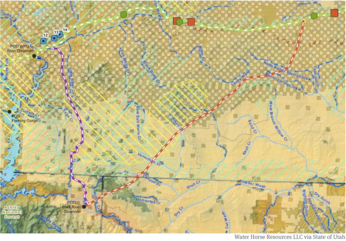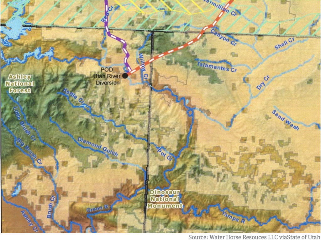 A detail of a map produced by Water Horse Resources, and published by the state of Utah, showing the proposed diversion point on the Green River, between Flaming Gorge Reservoir and the Gates of Lodore in Dinosaur National Monument. The red and white line represents a pipeline that heads northeast out of Utah, across a corner of Colorado, and into Wyoming, where it joins an alignment of another potential pipeline that is connected to the Green above Flaming Gorge.