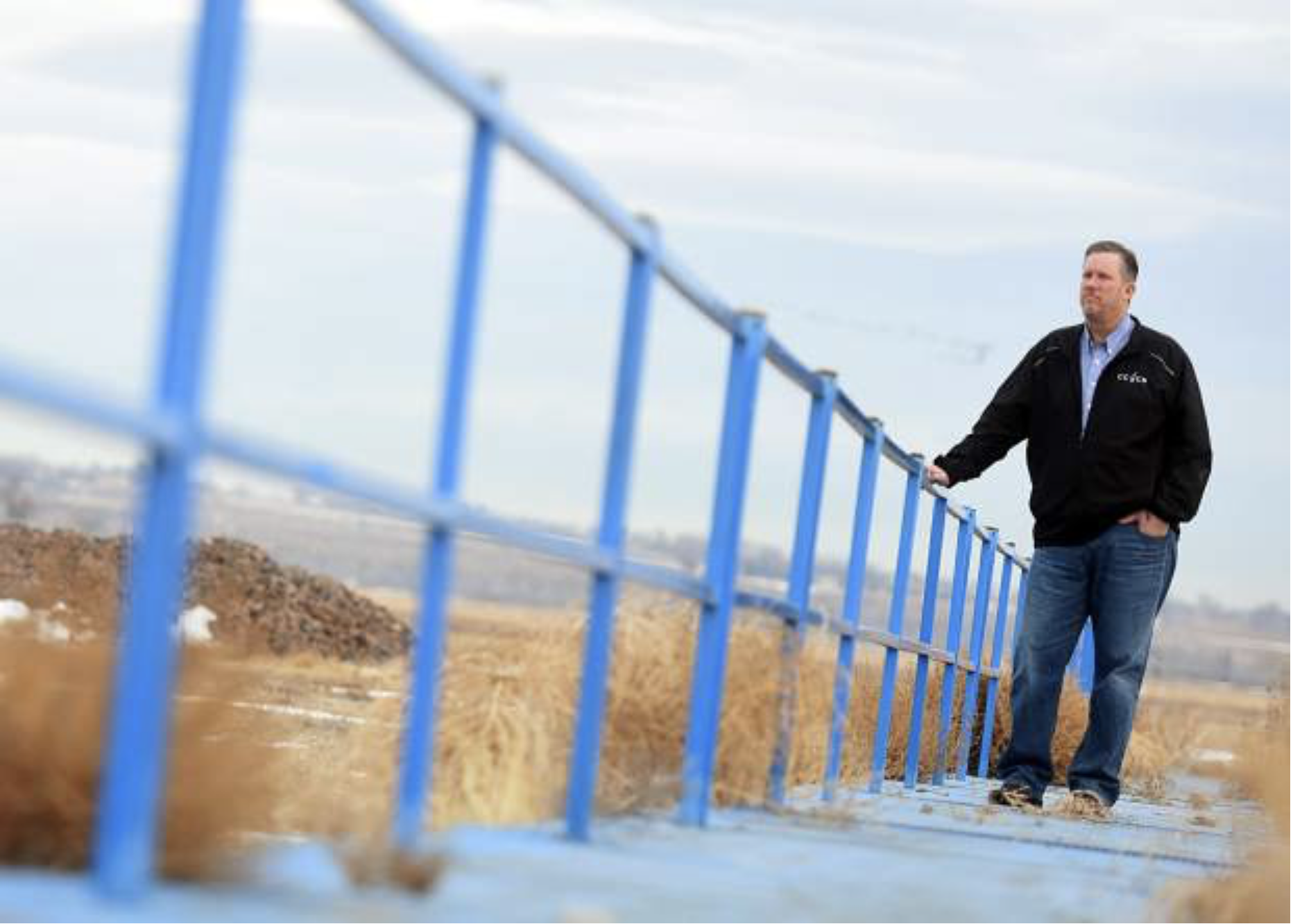 Randy Ray, executive director of the Central Colorado Water Conservancy District, stands on top of the grate protecting a ditch that runs from an artificial recharge facility near Gilcrest. The CCWCD has expressed interest in water being piped into the Front Range.