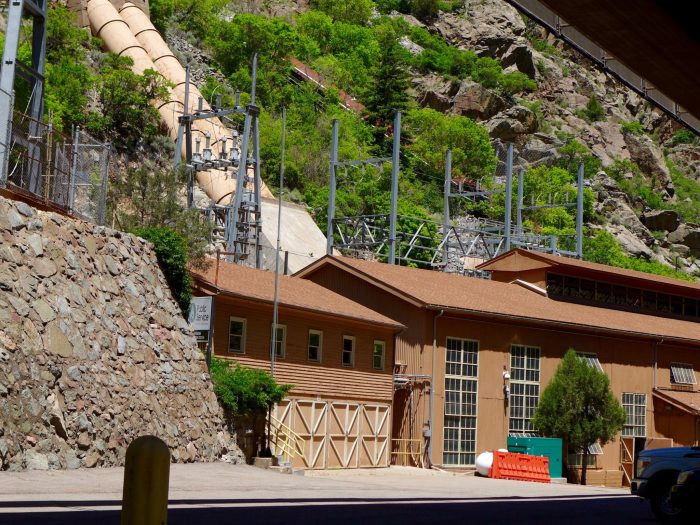 The water used by the Shoshone plant is diverted at a low riverwide dam about two miles above the plant near the Hanging Lake exit on Interstate 70. The water is then sent through pipes along the cliffs to penstocks that send it down to the plant, where it spins turbines. All of the water is then released back into the river via a spillway at the top of what’s called the “Shoshone” section of the Colorado River, which is about five miles east of Glenwood Springs and is popular with kayakers and rafters.