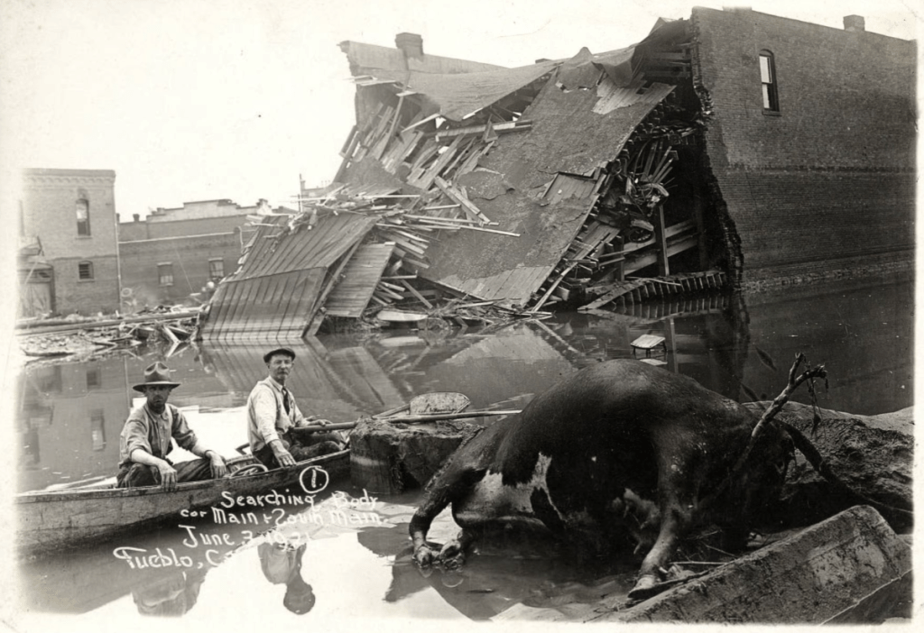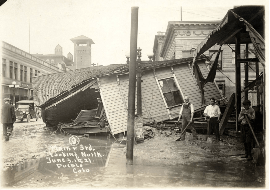 Downtown Pueblo and the surrounding farms were destroyed. More than 57,000 acres of ag land were flooded, and close to 5,000 acres became fully unusable. Passengers on the Missouri Pacific and the Denver and Rio Grande Western trains were swept into the river, Estimates of how many people died vary between about 80-120, though a report by the U.S. Department of the Interior conducted in 1922 states that “the exact extent of losses to life and property will never be known.”