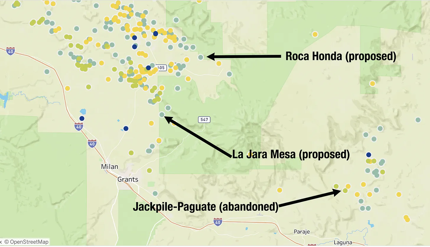 There are currently two proposed uranium mines on the forest, which includes Mount Taylor and surrounding areas near Grants, New Mexico. Energy Fuels — the owner of the Pinyon Plain uranium mine and the White Mesa uranium mill — is looking to develop the Roca Honda mine on about 183 acres. And Laramide Resources wants to build the La Jara Mesa mine. Both projects would be underground, not surface mines, and were originally proposed over a decade ago, but stalled out when uranium prices crashed. Now that prices have increased, the firms have expressed renewed interest.