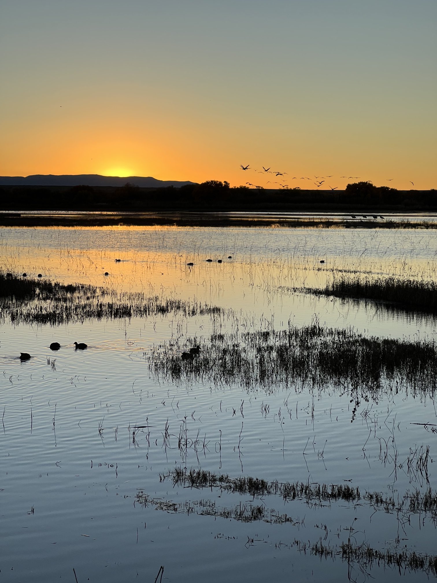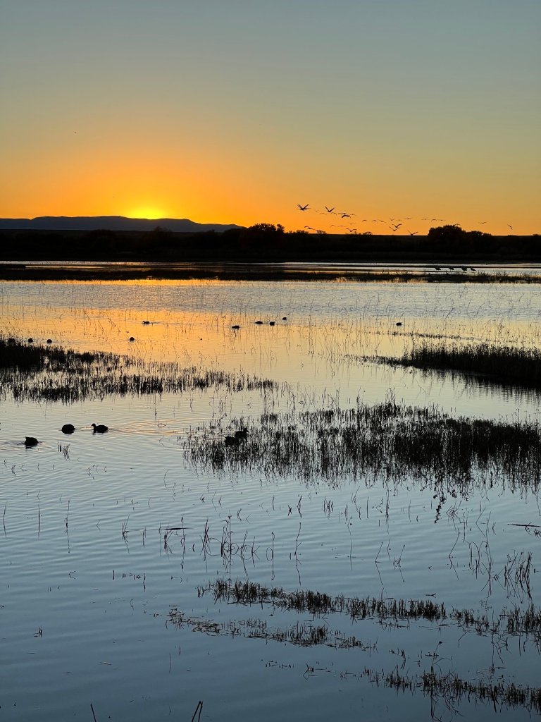 Sandhill cranes and some mallard ducks roost on a sandbar of the Rio Grande River at sunset on Jan. 22, 2025 in Albuquerque, New Mexico. Copyright Credit ยฉ WWF-US/Diana Cervantes.